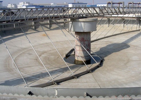 原水從池底經(jīng)中心支墩上部流出,并經(jīng)導(dǎo)流筒配水后,呈輻射流向池子周邊集水槽出水,隨著輻向流速的降低,原水中的懸浮物被分離而沉降于池底。旋轉(zhuǎn)桁架以中心支承為圓心,端部走輪在驅(qū)動裝置的作用下,沿池周軌道回轉(zhuǎn)運(yùn)行,帶動下部近似對數(shù)螺旋線運(yùn)行軌跡的刮泥板緩慢轉(zhuǎn)動,刮集至沉淀池中心集泥槽,依靠水壓或泵排出池外,上部浮渣由刮渣板同步刮至排渣斗排出。